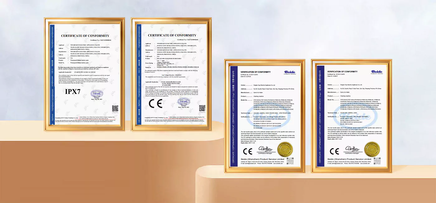 Mașinile noastre de spălat și răcitoarele de aer au trecut standardele de testare ale UE și au obținut certificarea CE. Bateria are un grad de impermeabilitate IPX7. Suntem, de asemenea, certificați ca un vânzător remarcabil pe platformele interne de comerț electronic și pe Alibaba.